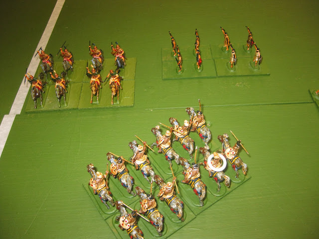 That front line of three elephants looks quite nasty, to put it mildly, especially with the "long bow lanes" to allow for missile support. The Heavy Chariots are similarly unpleasant, with a decent saving roll, although with the full four bases deployed they have an awfully big flank.