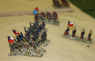 By turn 3 Phil had arrived and took over the Chilean right flank. Chris blazed away with his artillery, inflicting steady casualties on the advancing troops. No sophisticated tactics here, which is about right.