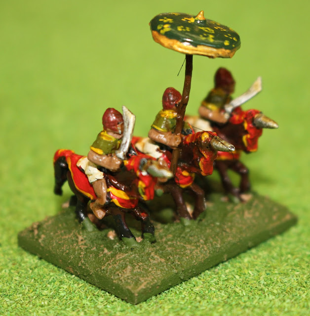 These are the compulsory cavalry unit (Cv). I have a problem with this in the army as the jury is definitely out as to whether the reliefs show cavalry units or command staff. They don't seem to show units, and the Khmer had many elephants and few horses, which had to be imported from India. This group are mounted on "Dragon" horses and also have a "standard bearer", who has a parasol. (Irregular Miniatures V39 and V40). The evidence for Dragon Horses in Khmer armies is pretty thin as well, but having once been mentioned it becomes something "every wargamer knows", so they're accepted. Personally I think these should be an optional element, allowing the way for another elephant. I painted them in green tunics to indicate their officer status.