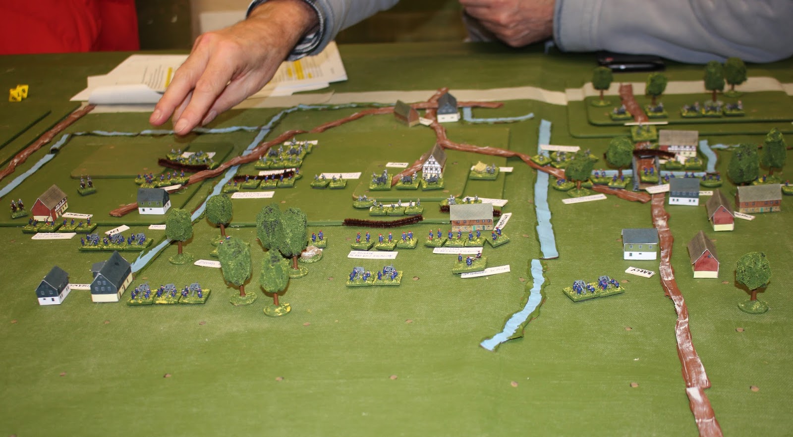 On my right the Germans have retired behind the river. That playing card you can see means that the 3rd Division is on the point of exhaustion. I only need to inflict another casualty and they're bound to fail the test and fall apart. The high value tile here means that I move late in the turn, so unfortunately for me Gary is able to bring up and deploy some guns to strengthen his line .