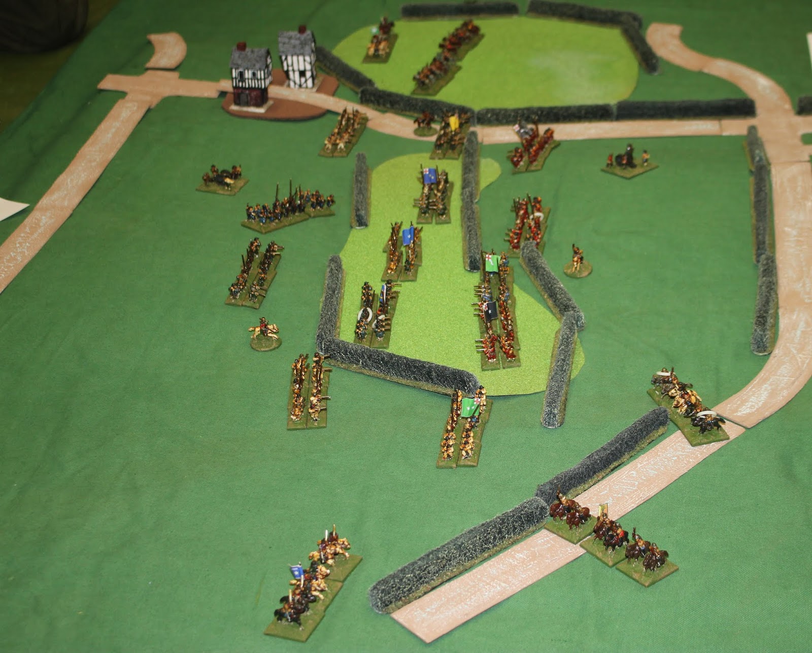 The site of the battle is disputed, but we know both armies formed up on hill crests with some scrubby land between them, signified by the light green areas surrounded by hedges. Any units in there move at half speed and count as being in cover when fired at.
