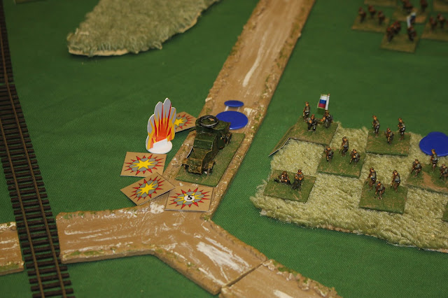 For this game I scattered a few fields providing light cover across the table, and pitched a smaller, more experienced White Regiment against a couple of Red Regiments, including some recent conscripts. The Whites had an armoured car, the Reds some cavalry. Both sides had a small artillery battery. I'm mixing things up to try out different combinations for the rules. The scenarios aren't too clever for now. Mostly capture a road/rail junction, and shoot up the enemy.