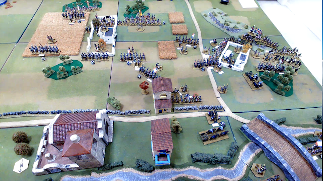 The French are near the camera. Phil is on the left, Ian on the right and I have the centre. Ian's job is to hold the bridge and white building. I want to engage the centre to fix it in place, whilst Phil hooks round their right flank.