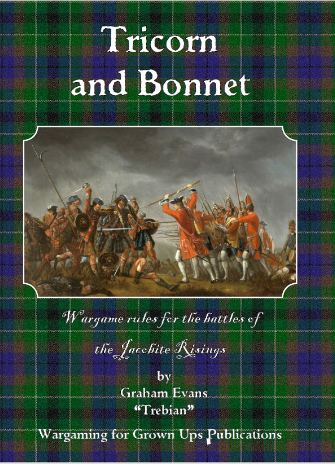 "Tricorn and Bonnet" is a set of tabletop figure wargames rules for fighting the battles of the Jacobite risings from Killiecrankie to Culloden Moor. The rule set is written to take account of the asymmetric style of warfare between regular European style drilled troops and the more martial clansmen who came out to support the House of Stewart after the 1688 "Glorious and Bloodless" revolution. As with all Wargaming for Grown Ups rule publications the back cover includes a comprehensive Quick Reference Sheet to aid game play.